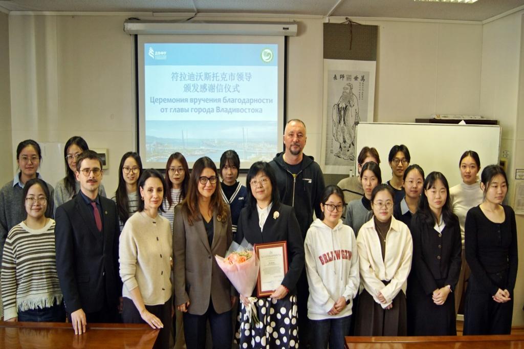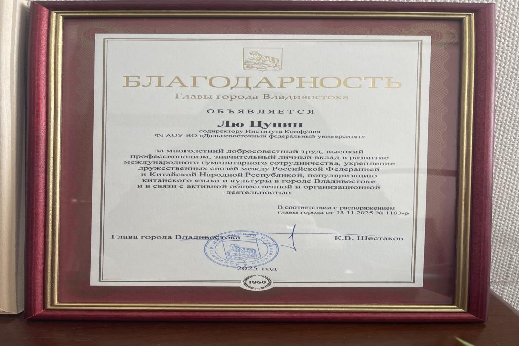 此次符拉迪沃斯托克市政府对我校孔子学院中方院长刘聪颖的表彰,是黑龙江大学与远东联邦大学共建孔子学院取得高度成功的体现。孔子学院作为我校与远东联邦大学合作的海外办学平台,在汉语普及与中国文化推广领域做出了巨大贡献,建院来已经培养知华、友华、爱华学员上万名,为中俄合作事业、俄罗斯政府各级部门输送大量优秀人才。未来,我校孔子学院将牢记初心使命,以语言为桥,以文化为纽带,继续为中俄两国人民相知相亲、风雨同舟的友好关系作出扎实而富有成效的贡献。(国际合作与交流处供稿)