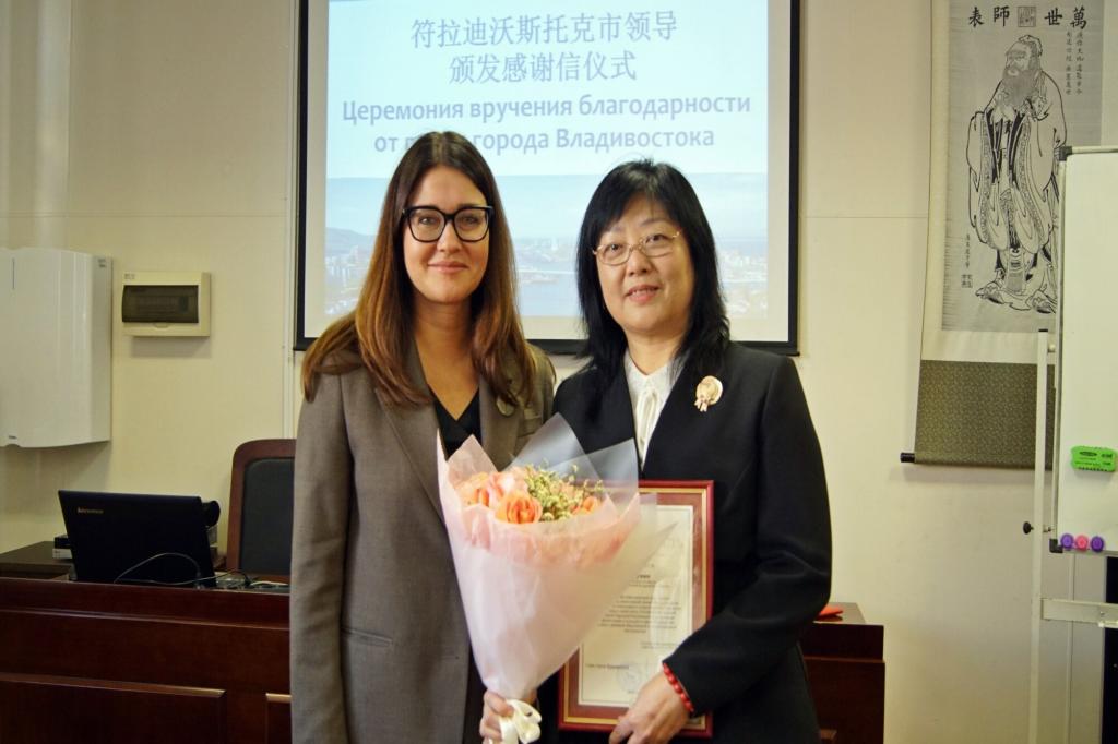 近日,受符拉迪沃斯托克市市长康斯坦丁·舍斯塔科夫的委托,符拉迪沃斯托克市副市长达莉亚·斯婕格妮专程到远东联邦大学孔子学院,为中方院长、黑龙江大学俄语学院教授刘聪颖颁发感谢信,以表彰其在孔院工作中的高度奉献精神与卓越工作能力。