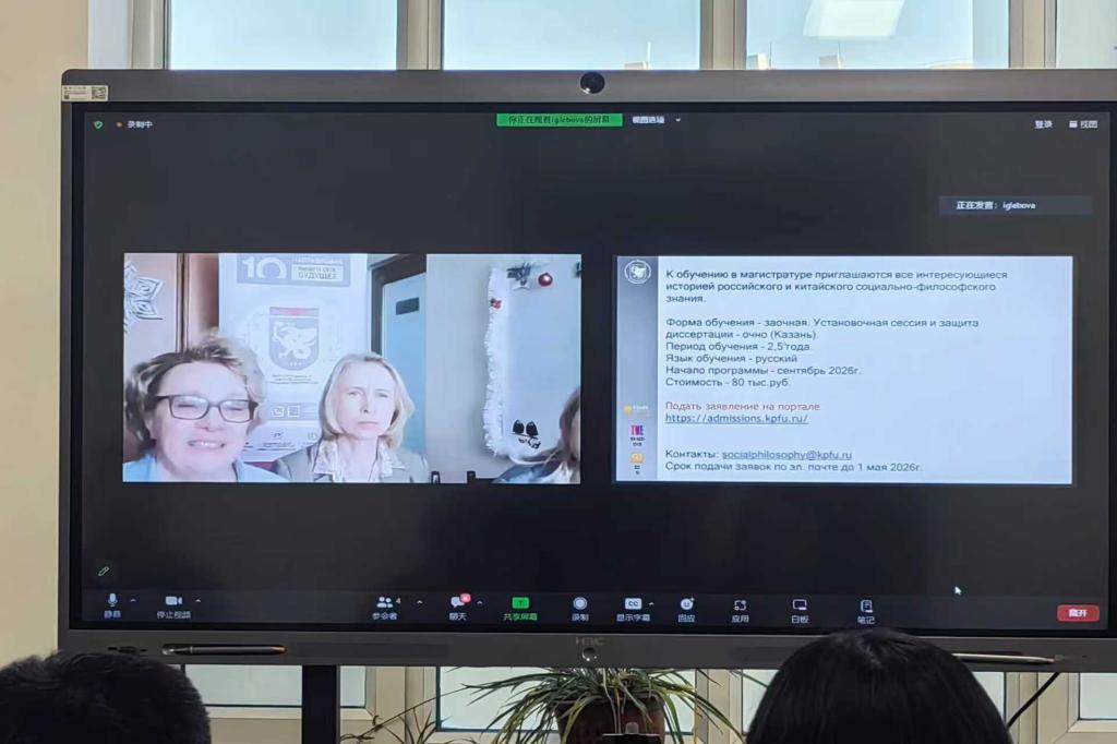1月14日下午,我校与俄罗斯喀山联邦大学举行线上工作对接会。俄中友好、和平与发展委员会科技与创新理事会主席戈洛梅科、喀山联邦大学社会哲学与大众传播学院社会哲学系主任波罗申科及相关负责人,我校国际合作与交流处处长胡晓枫、马克思主义学院院长王秋、哲学学院院长周来顺、国际合作与交流处副处长李永欣及相关负责人出席会议。会议由胡晓枫主持。