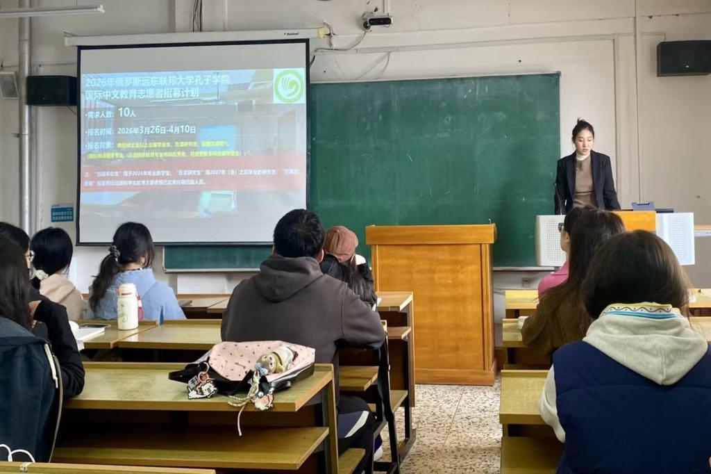 本次宣讲会分为两部分,第一部分为国际中文教育志愿者项目总体介绍,围绕项目背景、招募计划及相关政策进行系统解读。第二部分聚焦2026年俄罗斯远东联邦大学孔子学院志愿者招聘,重点介绍了我校孔子学院建设情况、志愿者工作内容与生活保障,并就选派流程、赴任准备等学生普遍关注的问题作详细解答。宣讲会现场互动积极,反响热烈,有效激发了同学们投身国际中文教育事业的热情。